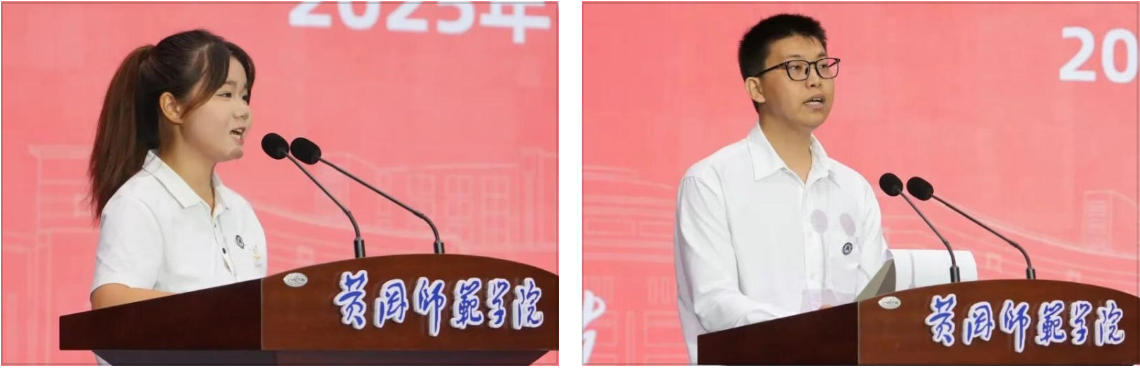 美术学院2022级吴可依同学分享了自身的获奖经历,鼓励大家在黄师这片沃土上“向下扎根、向上生长”,沉淀自我、逐梦前行;新生代表、2025级学科教学(思政)研究生王亿伯表达了重返母校读研的亲切与振奋,号召大家传承黄师百廿师范传统,接续奋斗,主动扛起新的责任与使命。