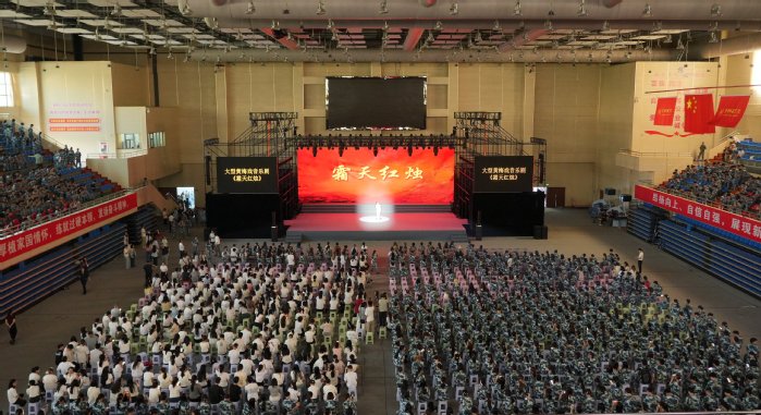 开学典礼后,6542名新生观看了大型原创黄梅戏音乐剧《霜天红烛》,同上第一堂“大思政”课。